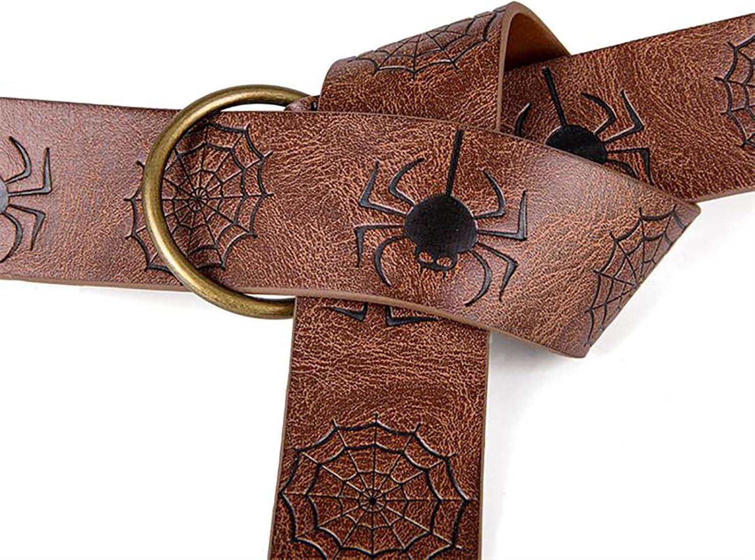 This men's belt is crafted from high-quality PU leather and features a unique embossed spider and spiderweb design.